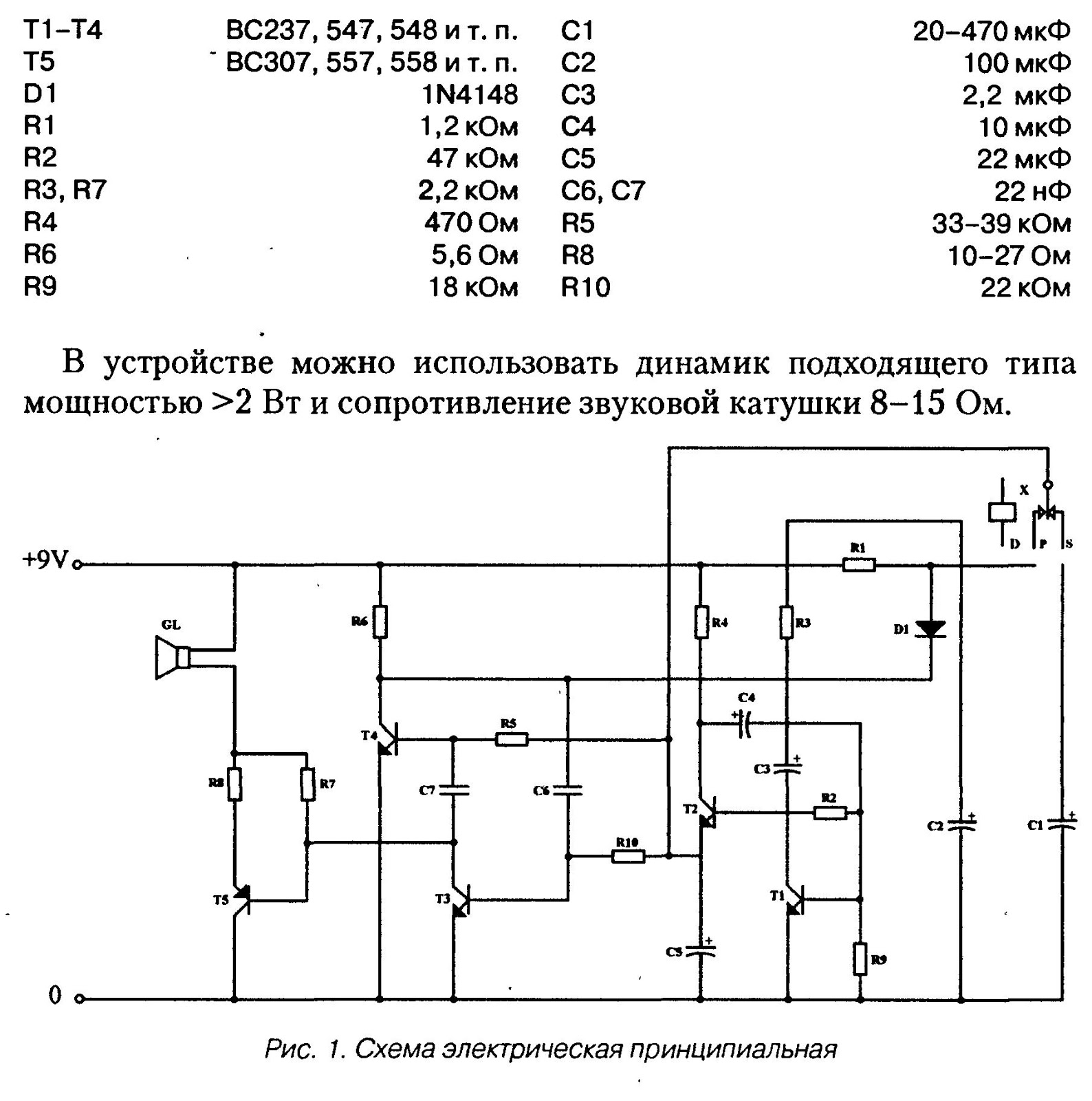 В устройстве можно использовать любой переключатель или проволочные скобы. Изменение тона получается при соединении точки X с точкой Р или S. При соединении точки X с точкой S получается сигнал скорой помощи, при соединении с точкой Р - сигнал пожарной службы, а в положении D - сигнал полиции.